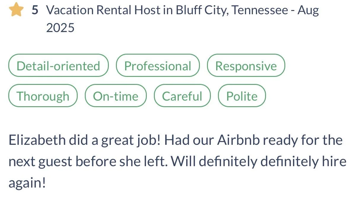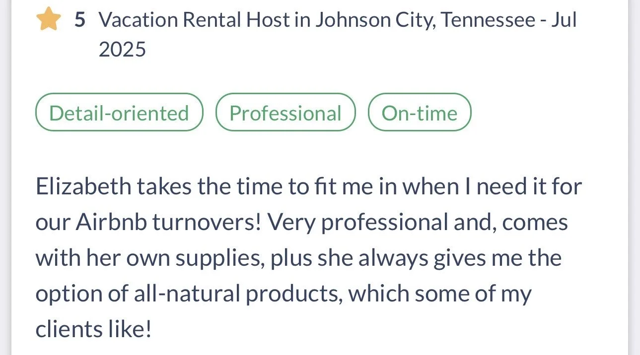 My name is Elizabeth Morgan, and I’ve been providing cleaning services locally in the Tri-Cities area for over six years. I take pride in creating clean, organized, and welcoming spaces for my clients. Beyond my work, I am a devoted mother to my energetic son and loving fiancée. When I’m not working or spending time with my family, I enjoy gaming or sitting out on my balcony. Chasing sunsets is also a favorite of mine!